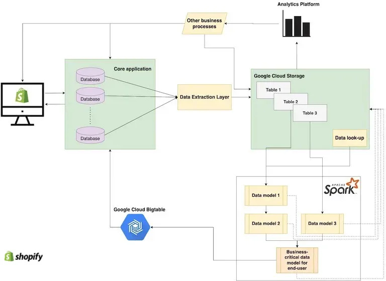 5- Data Integration: Extracting data from core application databases into a data warehouse on Google Cloud Storage, processing it, and loading the final model into Google Cloud Bigtable for the end user.