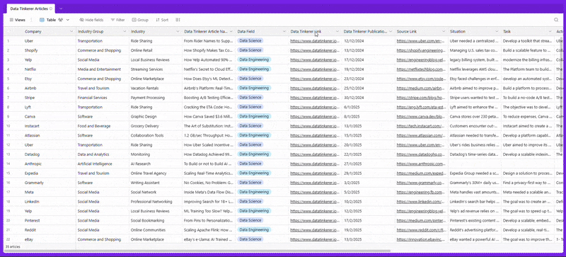 Access to the list of data science/data engineering articles published on Data Tinkerer broken down based on their stream (data science/data engineering), tech stack, company, industry and STAR format for ease of search and use