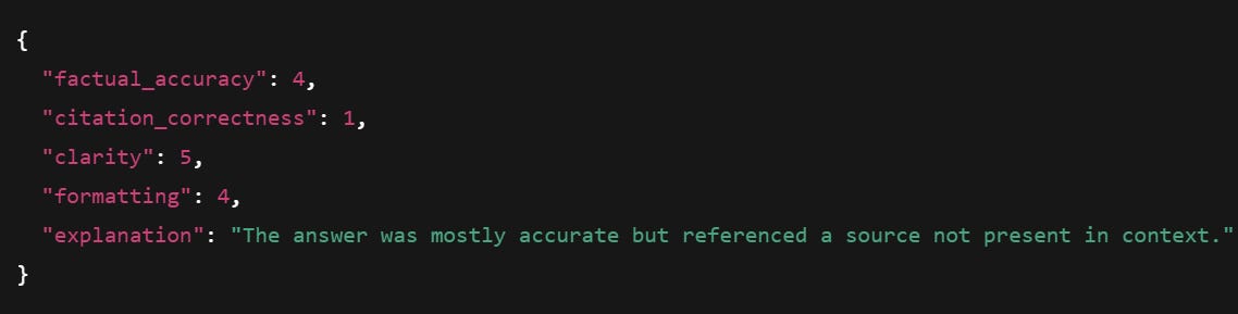 These were useful early on to catch obvious drift. They are not deployment gates. The team saw high ROUGE with missing citations, strong BERTScore with made-up file names and pretty Markdown that hid factual errors halfway down the page. In production, those are not edge cases. They are common.