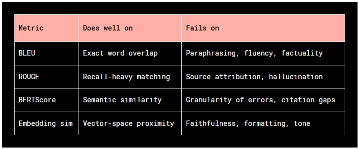 It is tempting to rely on familiar natural language processing metrics. BLEU, ROUGE, METEOR, BERTScore or embedding cosine similarity. These are fast and well known. They also miss the mark for real tasks like “answer with sources,” “summarise the wiki accurately,” or “parse a table into Markdown.”
