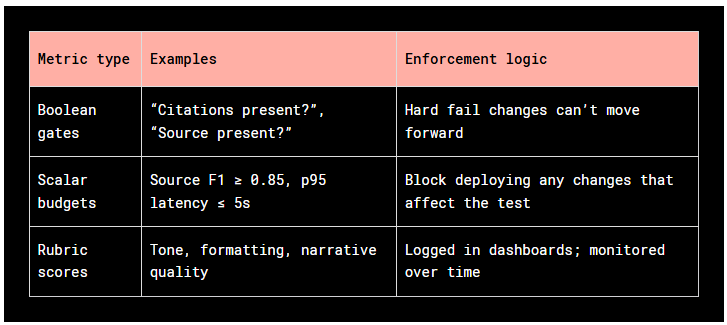 To enforce consistency, the team defined three metric types: boolean gates, scalar budgets and rubric scores. each one was baked into the development pipeline. Every model version, retriever tweak or prompt update was tested against these standards. If performance dropped, the change didn’t move forward.