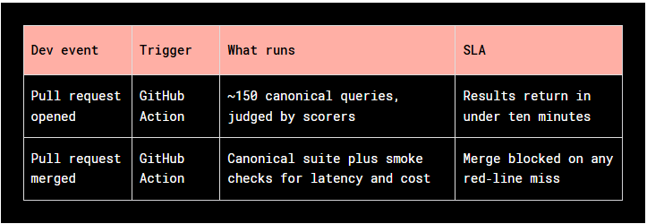 Merges. On merge, the system reran the canonical suite plus latency and cost smoke checks. If any red line tripped, the merge was blocked.