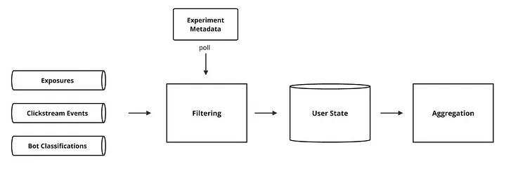 Next, they start pulling Kafka data together and counting exposures + metrics for each user.