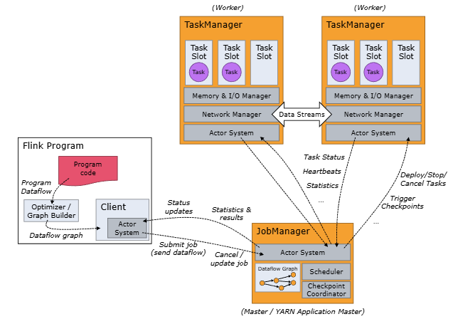 For a system that needs both high accuracy and high throughput, Flink gave the right mix of power and control. Flink apps run on a distributed cluster with a Job Manager (coordination) and Task Managers (actual work). It’s battle-tested and gave the Expedia team the low-level control they needed to wrangle user-level state.