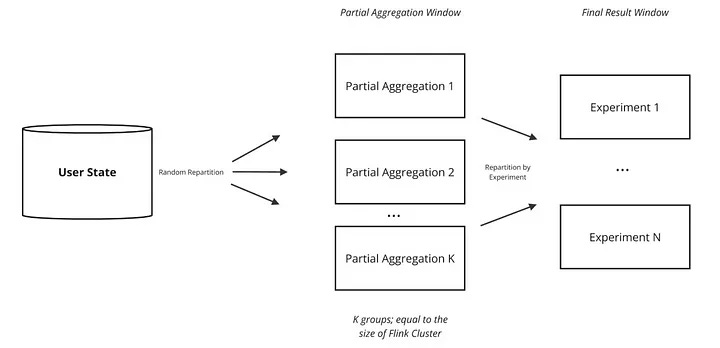 - Partial aggregation window: User-level exposures and metrics get split into K groups (where K = number of Task Managers). Each group calculates partial results for the last 24 hours.