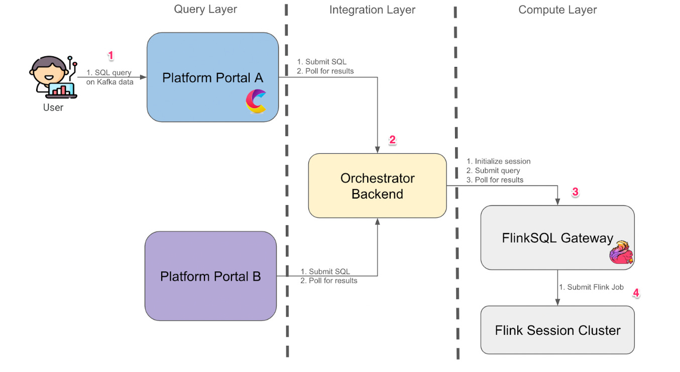 A user opens the platform portal and submits a SQL query against data in the Kafka online store