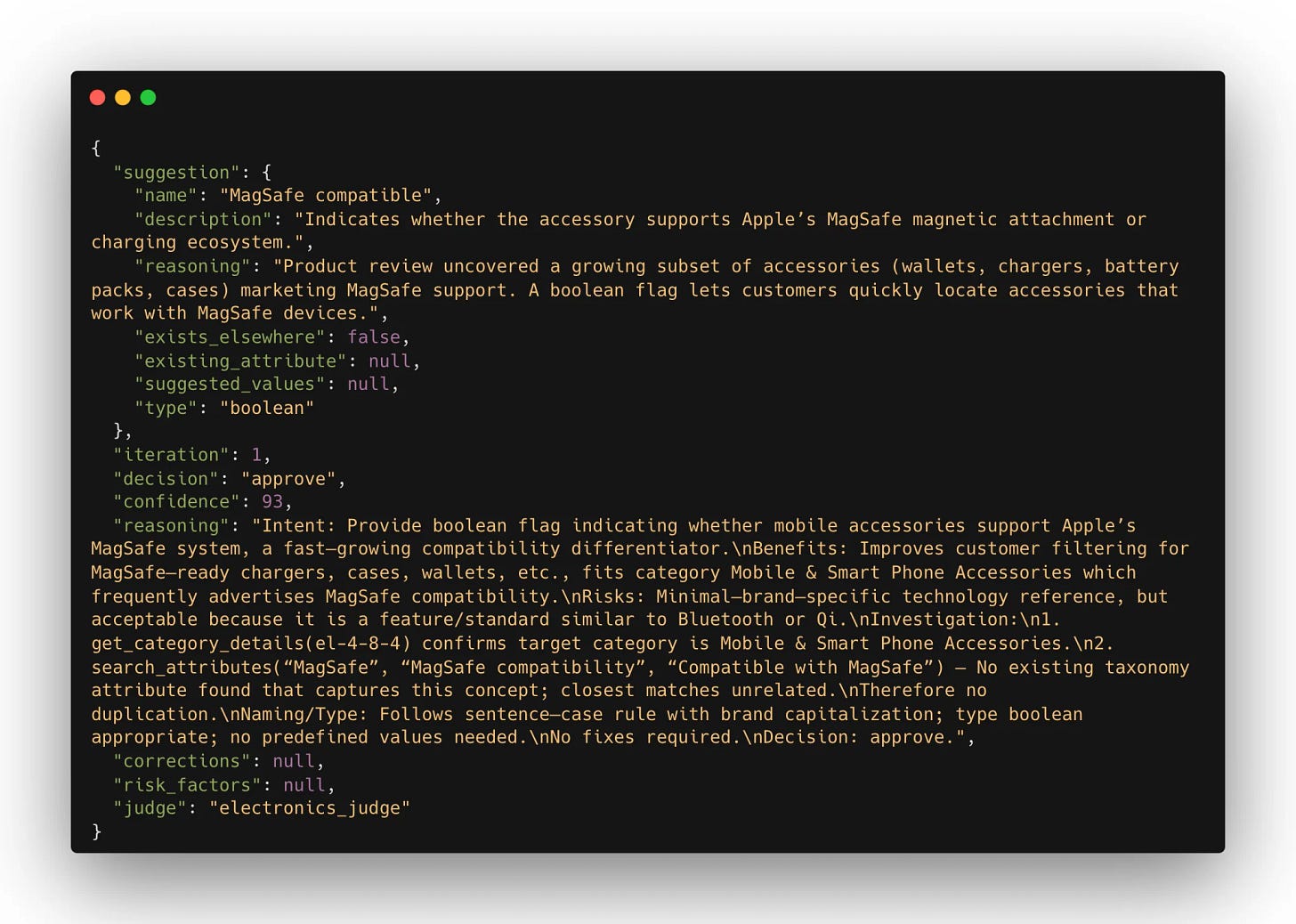 Taxonomy branches can be analyzed in parallel: hundreds of categories instead of a few per day. Quality improved via grounded merchant data + structural consistency, with judges filtering proposals (example: “MagSafe compatible” approved at 93% confidence).