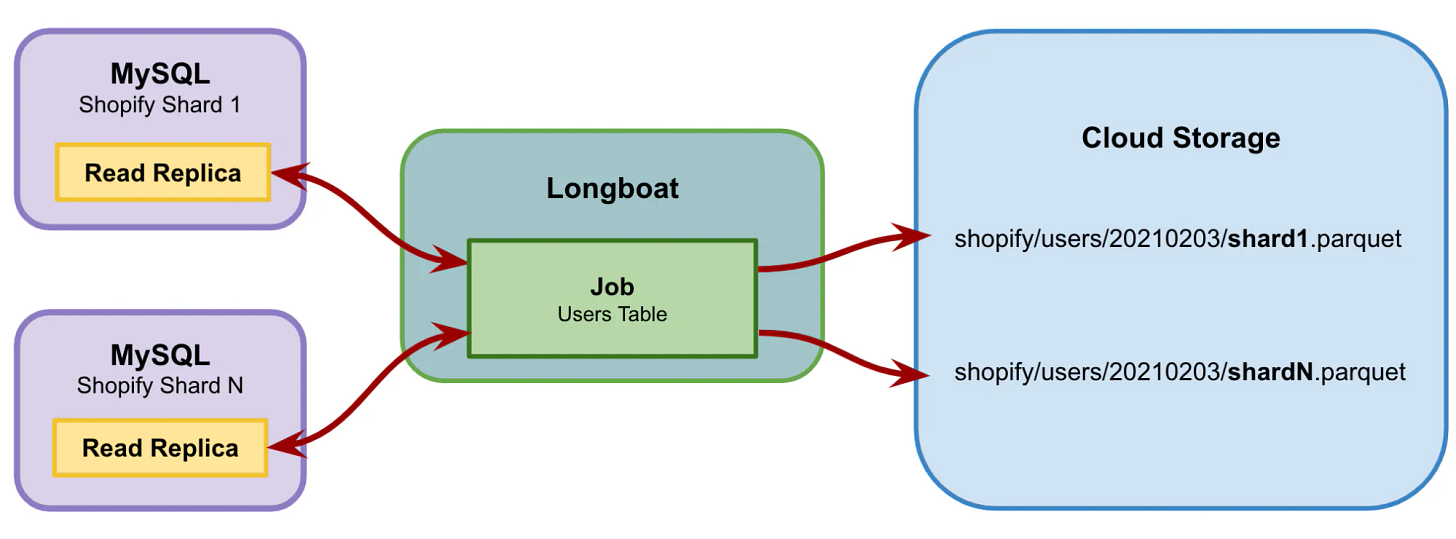 Longboat is Shopify’s internal query-based CDC service. It runs batch extraction jobs per table, per shard. Every run pulls rows updated since the last run then writes results to cloud storage.