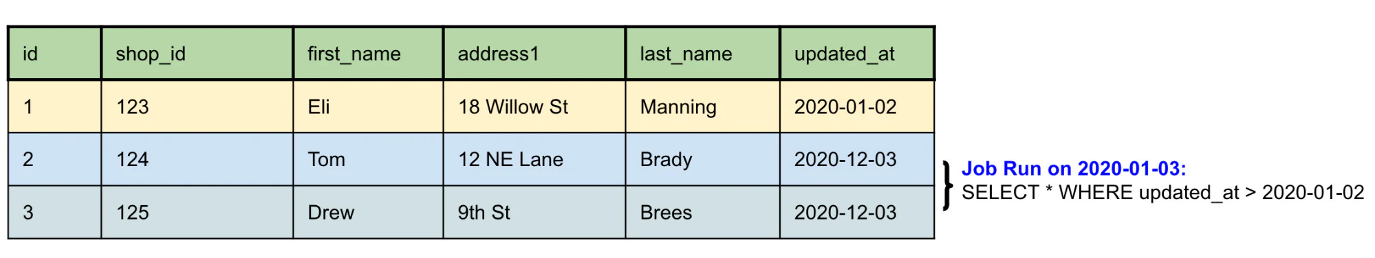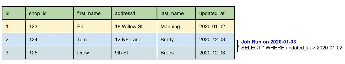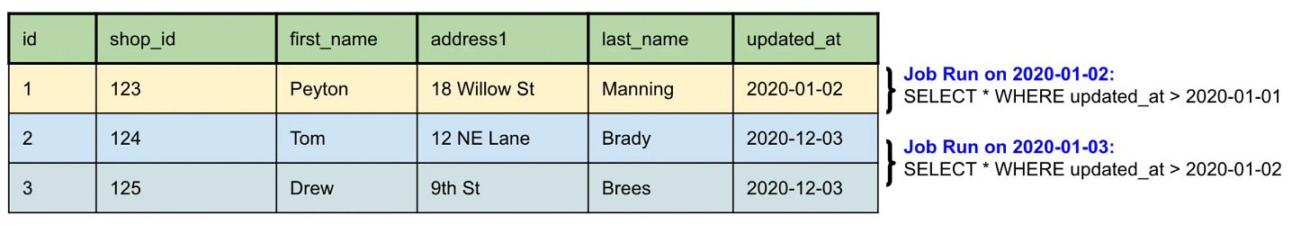 Using the earlier example, if Peyton’s name was updated to Eli, but the "updated_at" was never updated, that update would be missed downstream, as shown in the following figure.