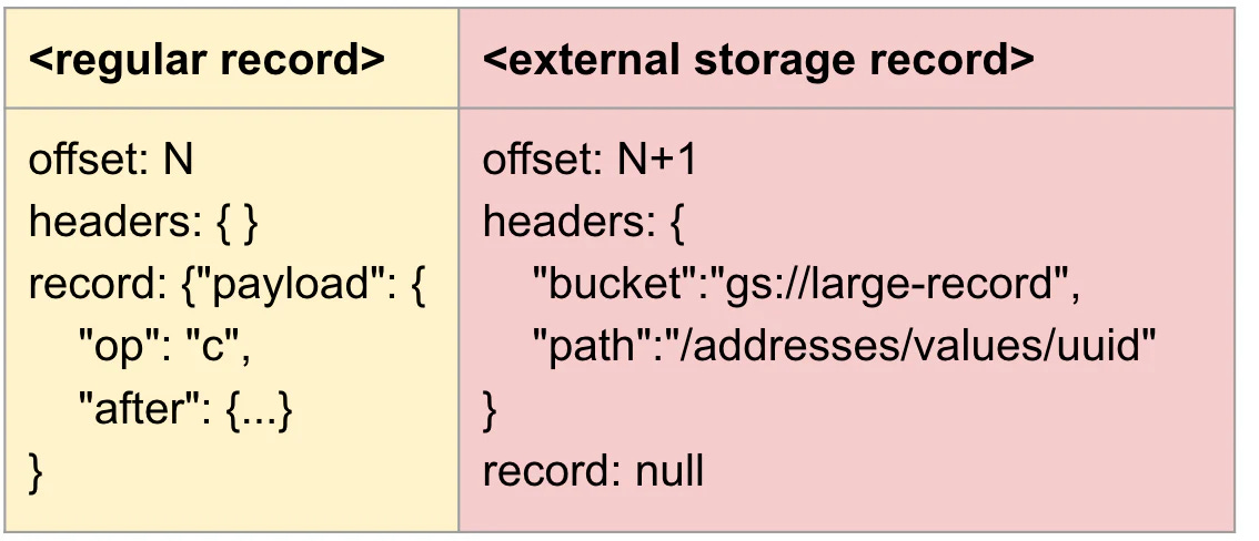 Here, a single Kafka record points to the payload stored in Google Cloud Storage (GCS). Kafka carries only the pointer; the data itself lives elsewhere.