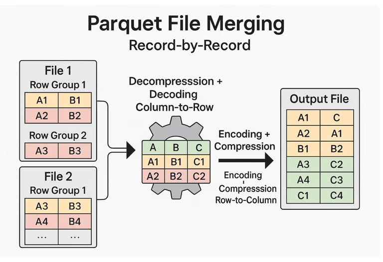 The common compaction approach merges Parquet files record by record. That means each file gets decompressed, decoded from columnar format into rows, merged, then encoded and compressed again. It works but it’s expensive and slow because you keep doing encode/decode work over and over.