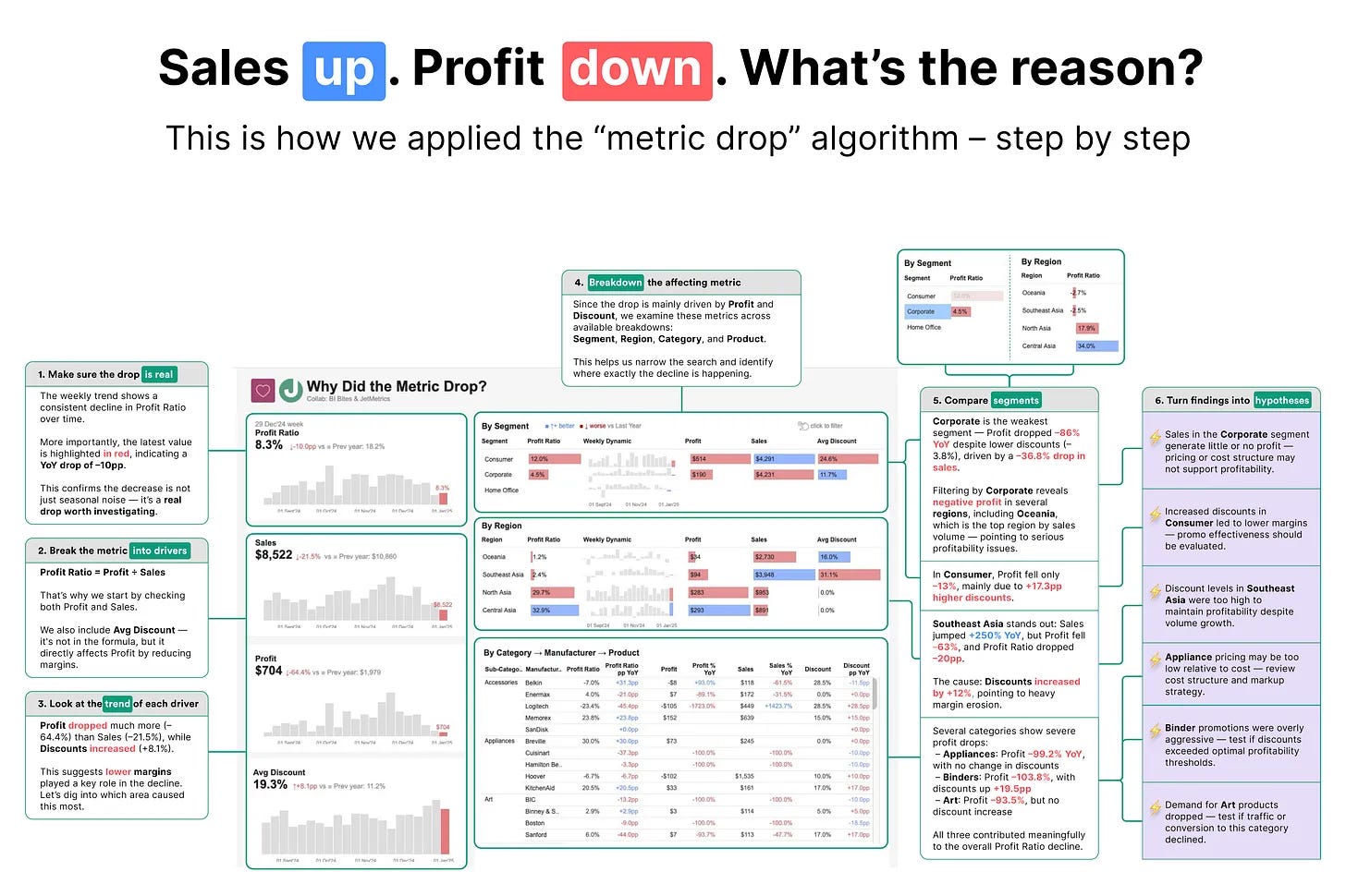 - Why Did the Metric Drop? (6 minute read) and do a great job showing how a simple, well-designed dashboard turns a 6-step metric framework into clear insights